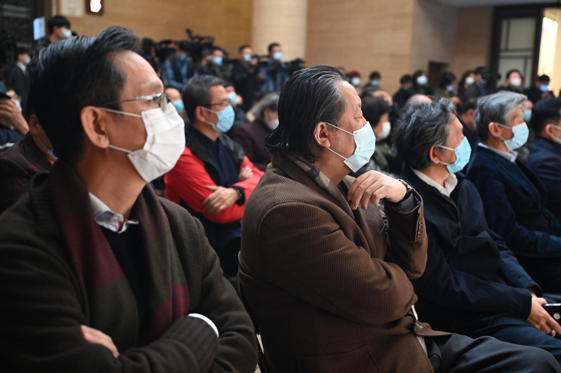 中国美协副主席何家英(左一),中国美协副主席、中国国家画院原院长杨晓阳(左二)等参加喻继高作品展开幕式