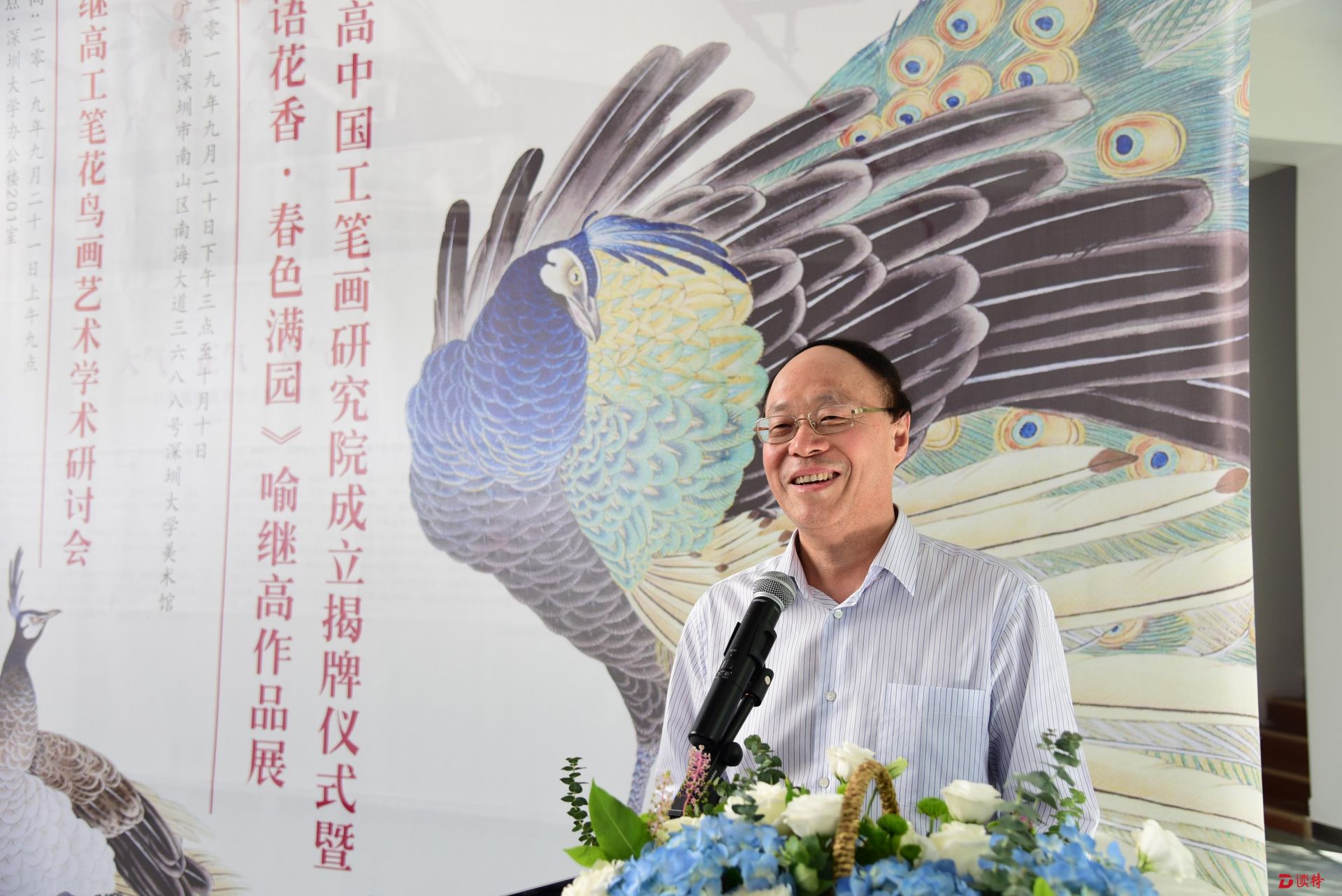 深圳大学建于1983年,建校36年来,学校已经发展成为一所拥有四万名师生员工,文、史、哲、经、管、法、理、工、医、教、艺等学科门类齐全的综合性大学,各项核心指标和综合实力,位居中国同类高校前列,被誉为全球进步最快的大学之一,培养了马化腾、史玉柱、周海江等十数万创新创业人才,为国家建设作出了重要贡献。2017年,学校出台了《深圳大学文化创新发展纲要》,提出要将深大建设成文化自信的排头兵、文化立校的典范、城市文化的风标和先进文化的策源地;今年8月,党中央、国务院出台《关于支持深圳建设中国特色社会主义先行示范区的意见》,明确提出深圳要率先塑造展现社会主义文化繁荣兴盛的现代城市文明,这为深圳大学大力发展文化艺术事业注入了强大的动力。我们相信,深圳大学喻继高中国工笔画研究院的成立,必将对深圳大学建设艺术学科高峰,传承和推动中华优秀文化走向世界,发挥重要作用!