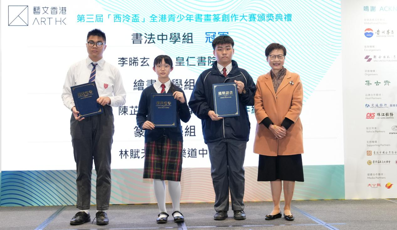 闭幕式上林郑月娥为中学组冠亚军学生颁奖
